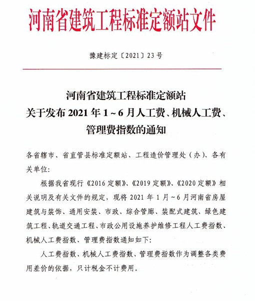 河南省建筑工程標準定額站關(guān)于發(fā)布2021年1~6月人工費、機械人工費、管理費指數(shù)的通知