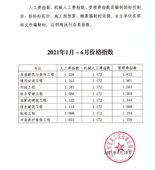 關(guān)于發(fā)布2022年1~6月人工費、機械人工費、管理費指數(shù)的通知
