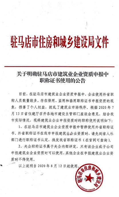 關于明確駐馬店市建筑業(yè)企業(yè)資質(zhì)申報中職稱證書使用的公告