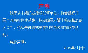 我廳從未組織或授權(quán)任何單位、協(xié)會組織開展“河南省住建系統(tǒng)上榜品牌展示暨上榜品牌表彰大會”,也從未邀請或要求相關(guān)單位參加此類活動。