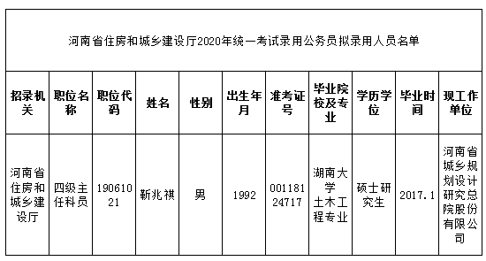 河南省住房和城鄉(xiāng)建設(shè)廳2020年統(tǒng)一考試錄用公務(wù)員擬錄用人員公示