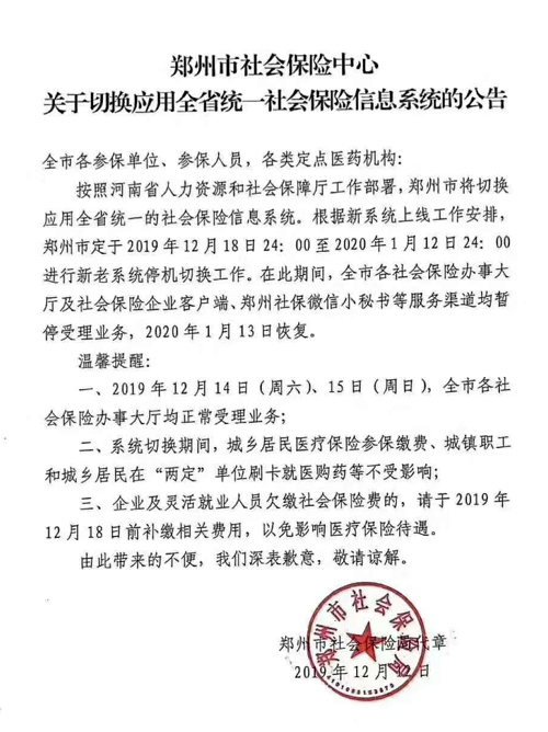 按照河南省人力資源和社會(huì)保障廳工作部署,鄭州市將切換應(yīng)用全省統(tǒng)一的社會(huì)保險(xiǎn)信息系統(tǒng)。根據(jù)新系統(tǒng)上線工作安排,鄭州市定于2019年12月18日24:00至2020年1月12日24:00進(jìn)行新老系統(tǒng)停機(jī)切換工作。在此期間,全市各社會(huì)保險(xiǎn)辦事大廳及社會(huì)保險(xiǎn)企業(yè)客戶端、鄭州社保微信小秘書(shū)等服務(wù)渠道均暫停受理業(yè)務(wù),2020年1月13日恢復(fù)。