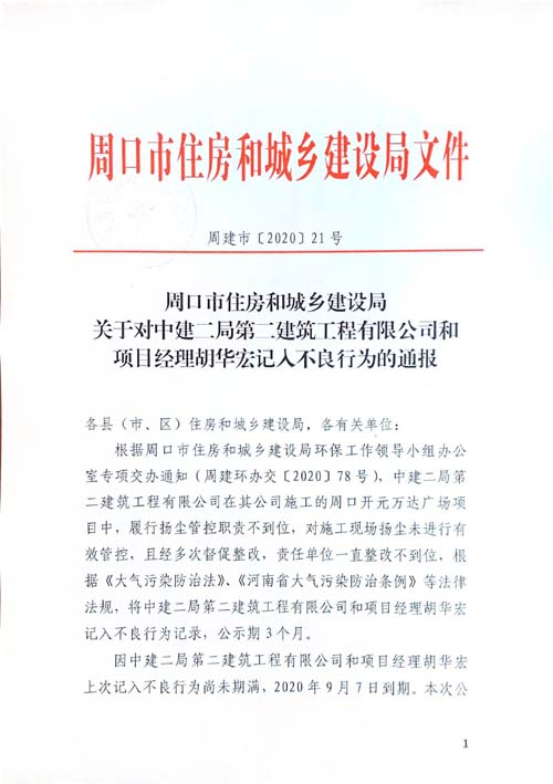 - 關(guān)于對(duì)中建二局第二建筑工程有限公司和項(xiàng)目經(jīng)理胡華宏不良行為的通報(bào)