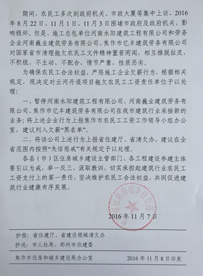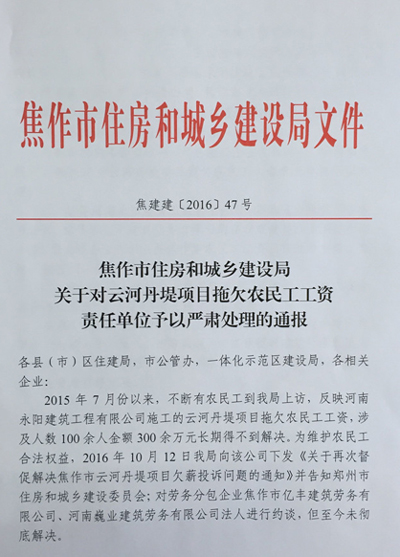 焦作市住房和城鄉(xiāng)建設(shè)局2016年11月7日發(fā)文通報(bào)云河丹堤項(xiàng)目拖欠農(nóng)民工工資處理意見通報(bào)。焦建建〔2016〕47號(hào)。