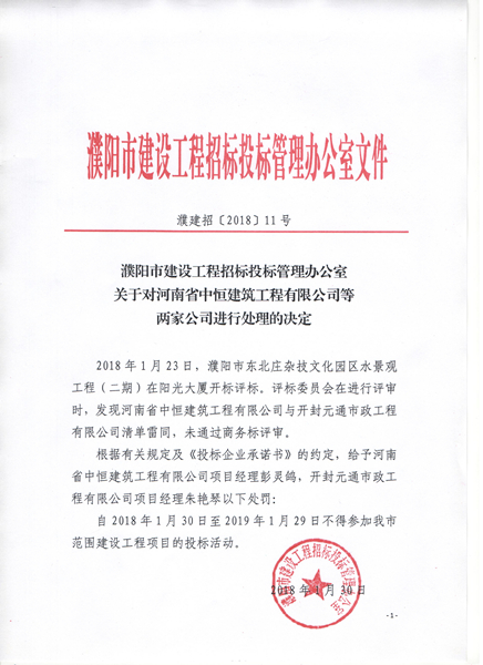 濮陽市建設(shè)工程招標(biāo)投標(biāo)管理辦公室關(guān)于對河南省中恒建筑工程有限公司等兩家公司進(jìn)行處理的決定