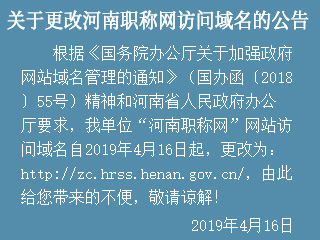 河南職稱網(wǎng)新網(wǎng)址(河南職稱網(wǎng)、河南職稱網(wǎng)官網(wǎng)、河南省職稱網(wǎng)、河南職稱網(wǎng)證書查詢、河南省職稱網(wǎng)官網(wǎng)、最新河南省職稱網(wǎng)),關于更改河南職稱網(wǎng)訪問域名的公告,自2019年4月16日起,由此給您帶來的不便,敬請諒解。