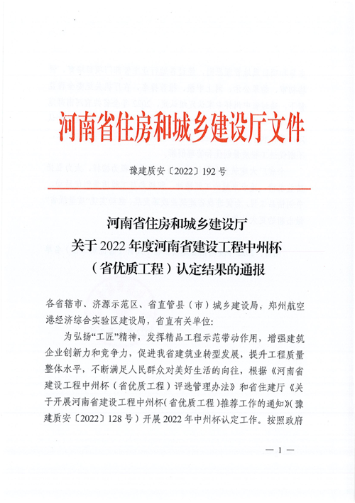 關(guān)于2022年度河南省建設(shè)工程中州杯(省優(yōu)質(zhì)工程)認(rèn)定結(jié)果的通報(bào)